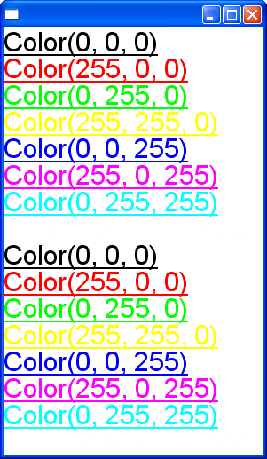 draw.DrawText(0, i * 30, AsString(c), Arial(30).Underline(), c);