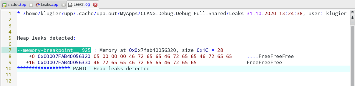 In "memory allocation serial number" each memory allocation has associated serial number (incremental). When U++ detects a leak, it dumps all leak blocks (note that sometimes you can resolve the problem just by examining its content) to standard .log file. You can see it in TheIDE by pressing Alt+L or by selecting "View log file" option from "Debug" menu: