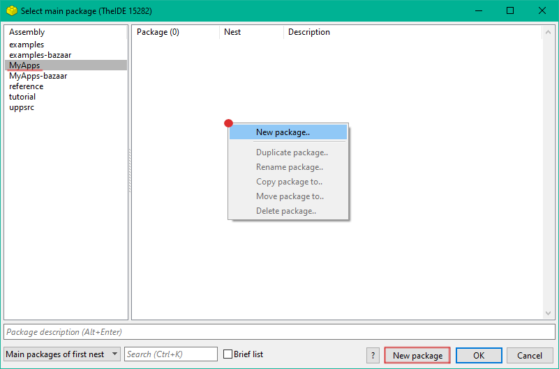 Before we start writing GUI applications, first we need to learn how to create U++ GUI application from template. As described in Getting started with TheIDE tutorial, let's start from invoking "Create new package" dialog. First of all let's select assembly in which GUI application will be created. For now, MyApps assembly seems to be a good starting point. To create the package you could click on "New package" button or right click on package list and then select "New package..":