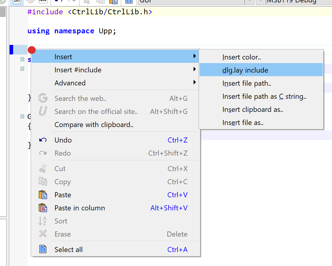 After creating GUI package, let's move to the coding part. To hide platform specific differences, U++ GUI application main function is defined using GUI_APP_MAIN macro: