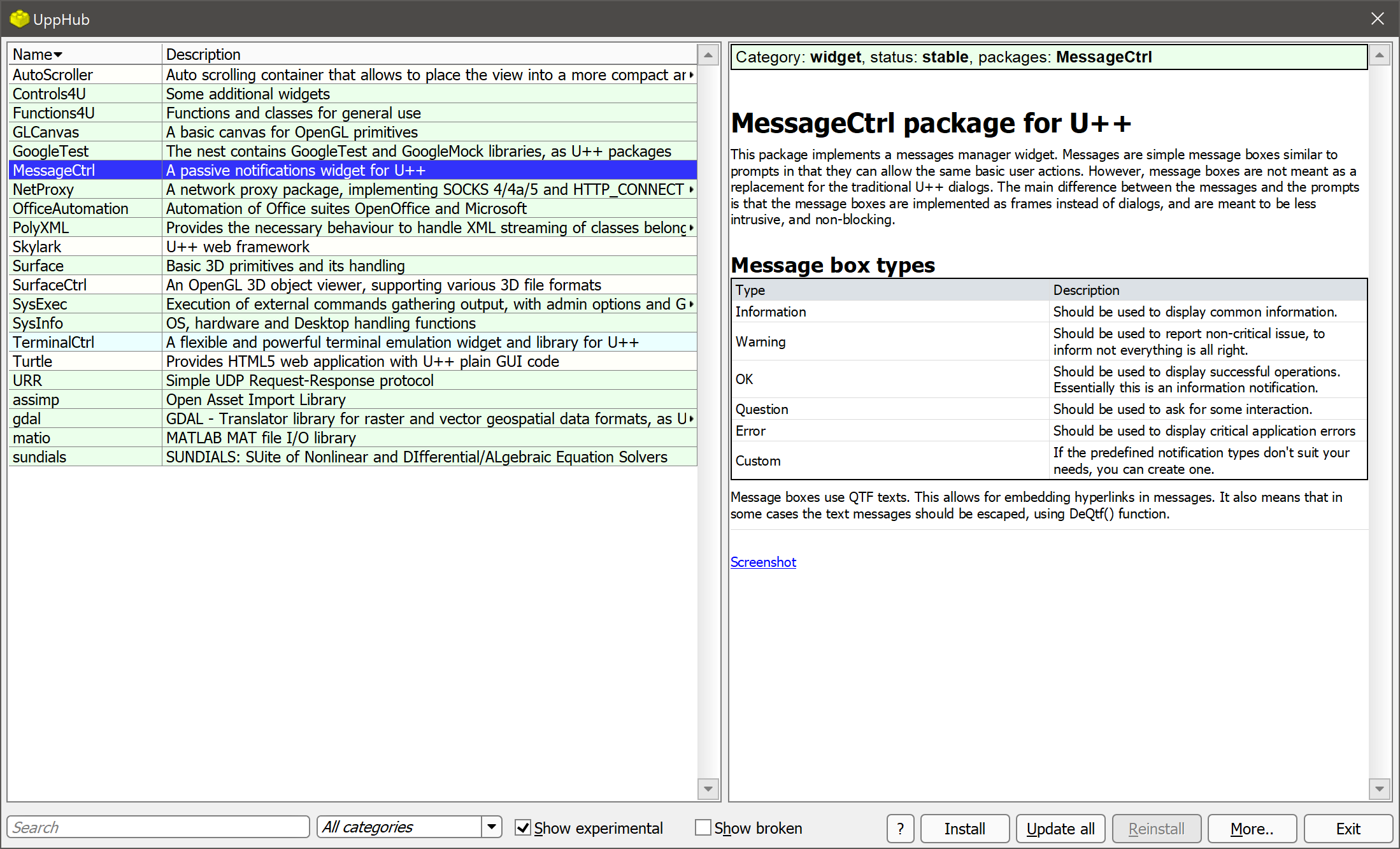 UppHub is a system intended to catalogue and install independently developed U++ packages over the network.