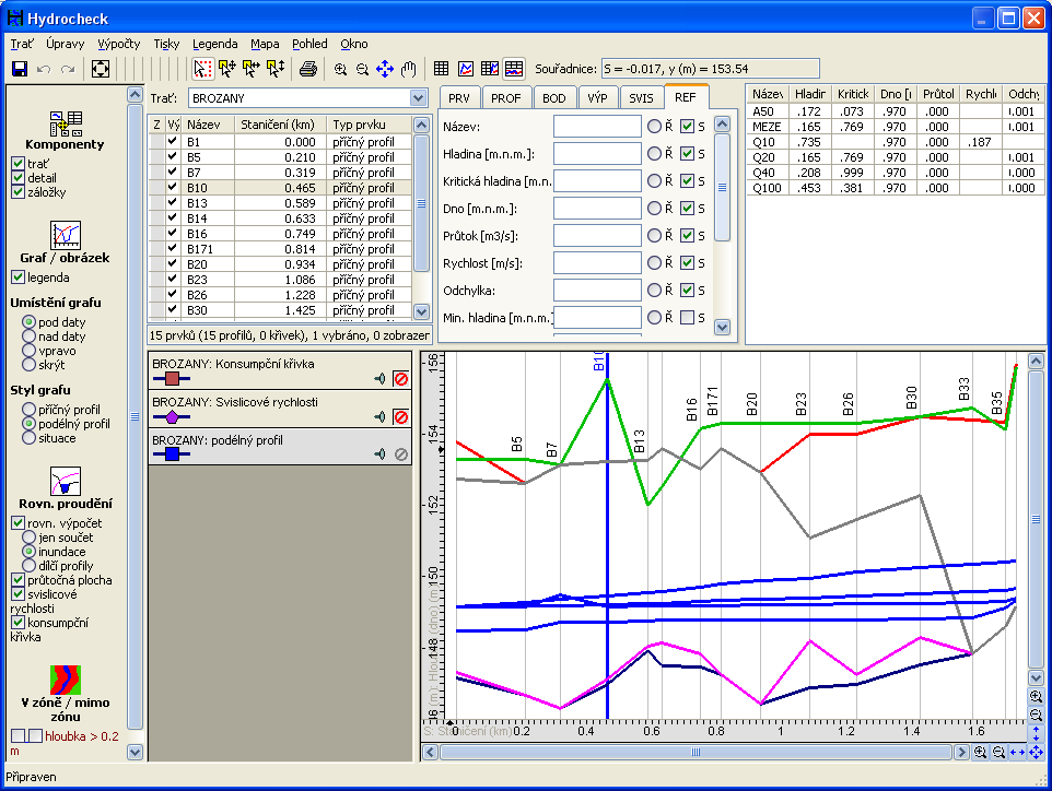 After composing the whole river section you can use built-in calculation to calculate steady flow parameters. (As of November 2005, the flow calculator is not yet finished. It is scheduled for further development in the year 2006.)