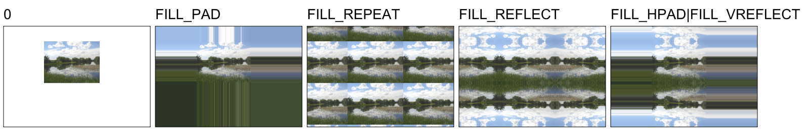 Fills or strokes the path with image. The placement of image in the path is defined by transsrc transformation that maps image coordinates to current painter coordinates or alternatively by line segment p1 p2 / x1 y1 x2 y2 that represents top border of image. flags can provide FILL_FAST flag that changes image interpolation to fastest nearest-neighbor method and also provides the information about pixels outside image a combination of FILL_HPAD, FILL_HREPEAT, FILL_HREFLECT, FILL_VPAD, FILL_VREPEAT, FILL_VREFLECT, FILL_PAD, FILL_REPEAT, FILL_REFLECT, where H means extension to left/right, V up/down, PAD means repeat border pixels, REPEAT means repeat image pixels, REFLECT repeat image pixels but flip adjacent images: