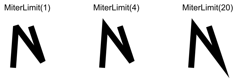 Defines a limit on the ratio of the miter length to the stroke width. Default value is 4. Past this maximum value, join reverts to bevel: