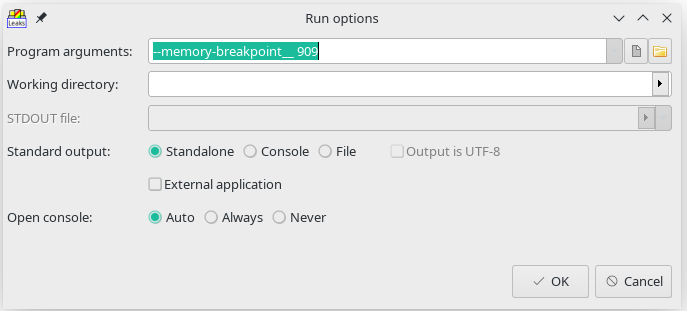 Now the window where command line arguments for application can be specified should appears. In this case we need to add "--memory-breakpoint__ ${serial_number}" as argument. In our example serial number is 925: