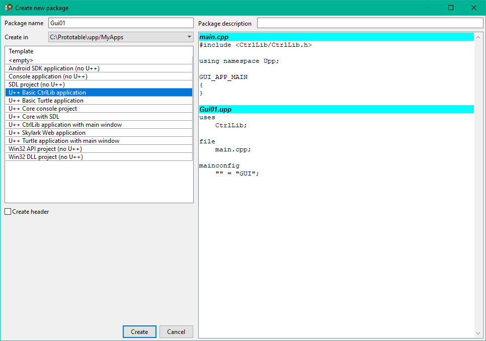 U++ Basic CtrlLib application - creates package with main GUI function and dependency to GUI packages (uses CtrlLib).