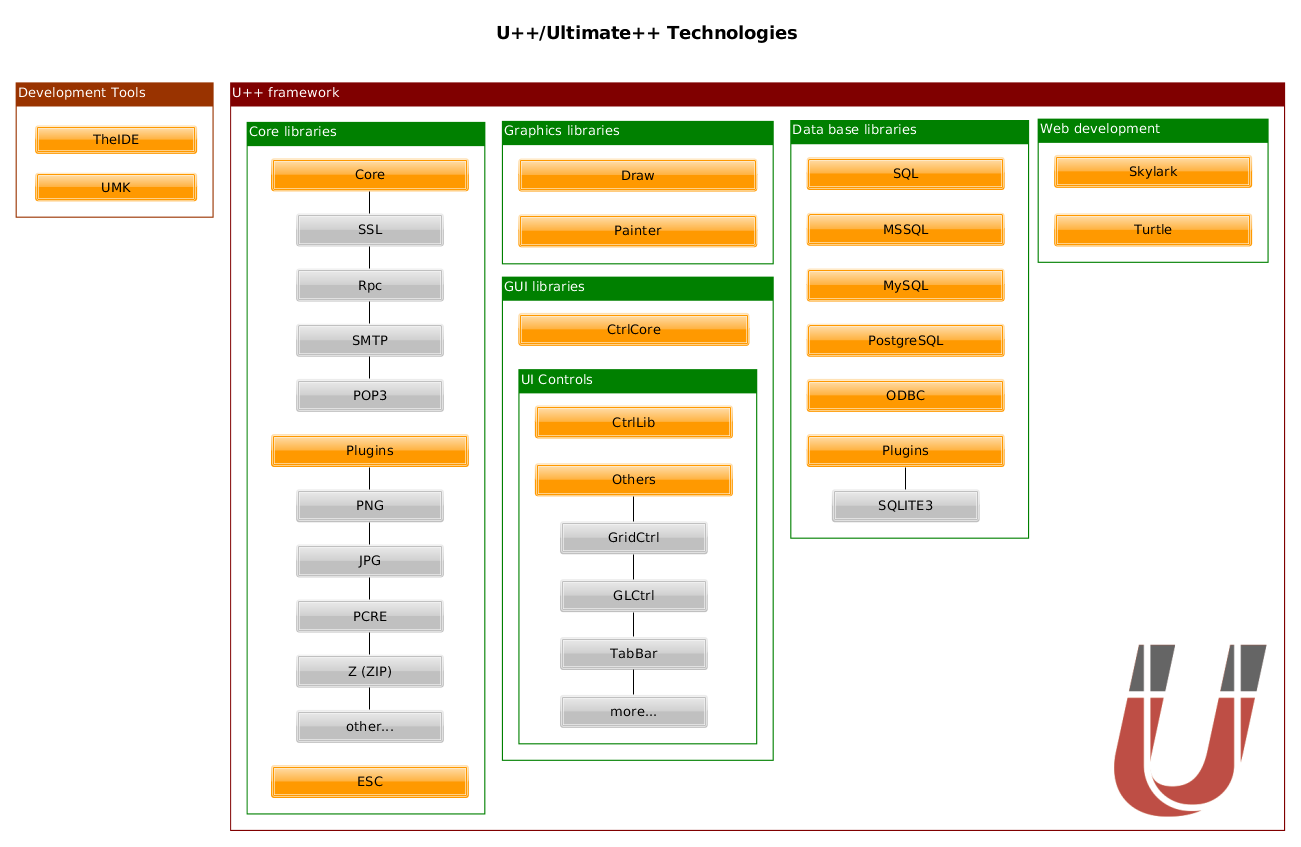 Below diagram presents the most important technologies that belongs to the U++ framework.